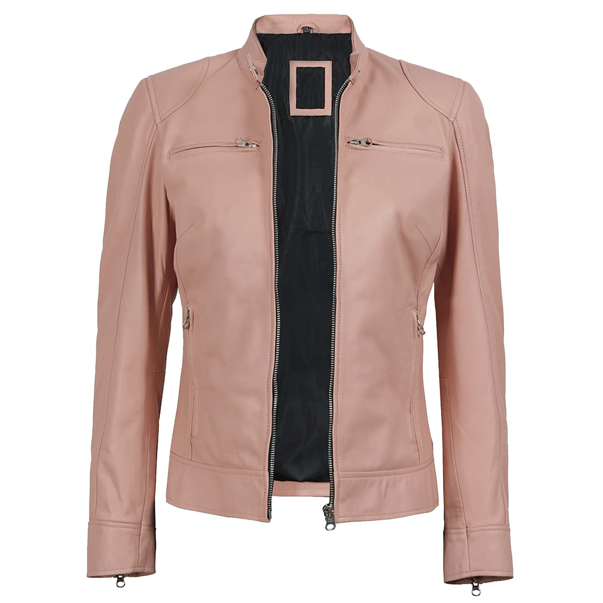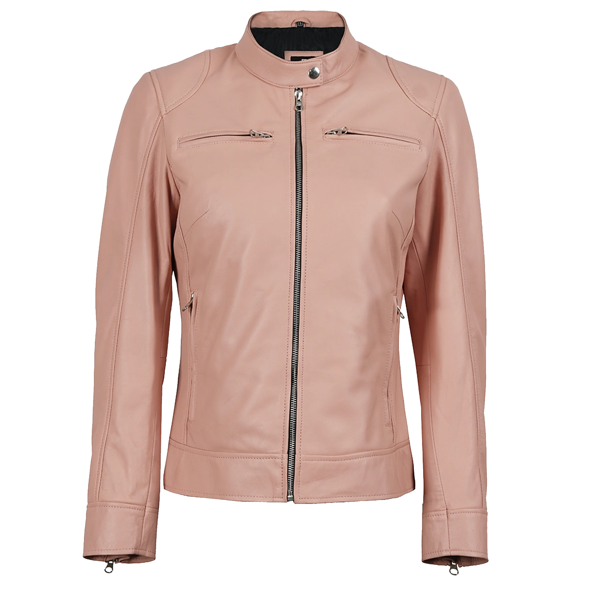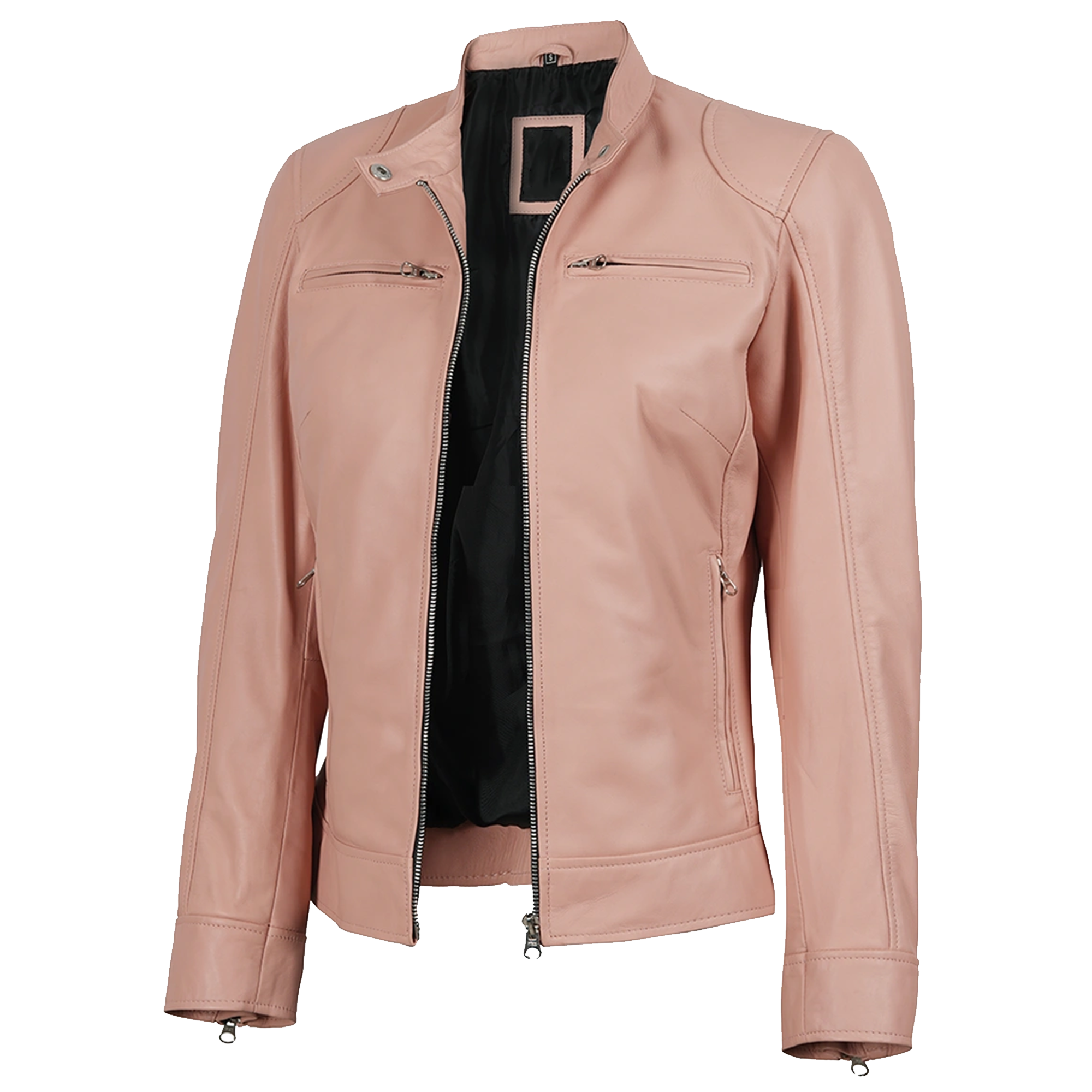 Redefine your style with our Women's Light Pink Motorcycle Cafe Racer Leather Jacket. A fusion of bold and essential function, this jacket is crafted for the modern female.