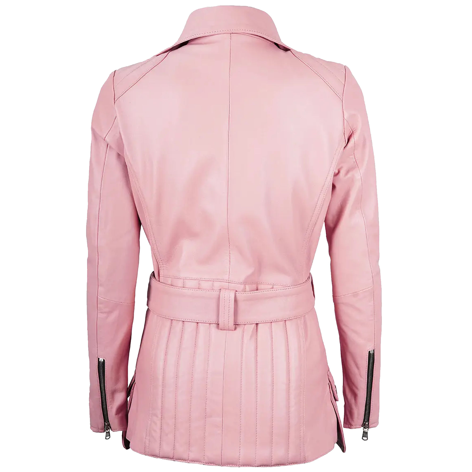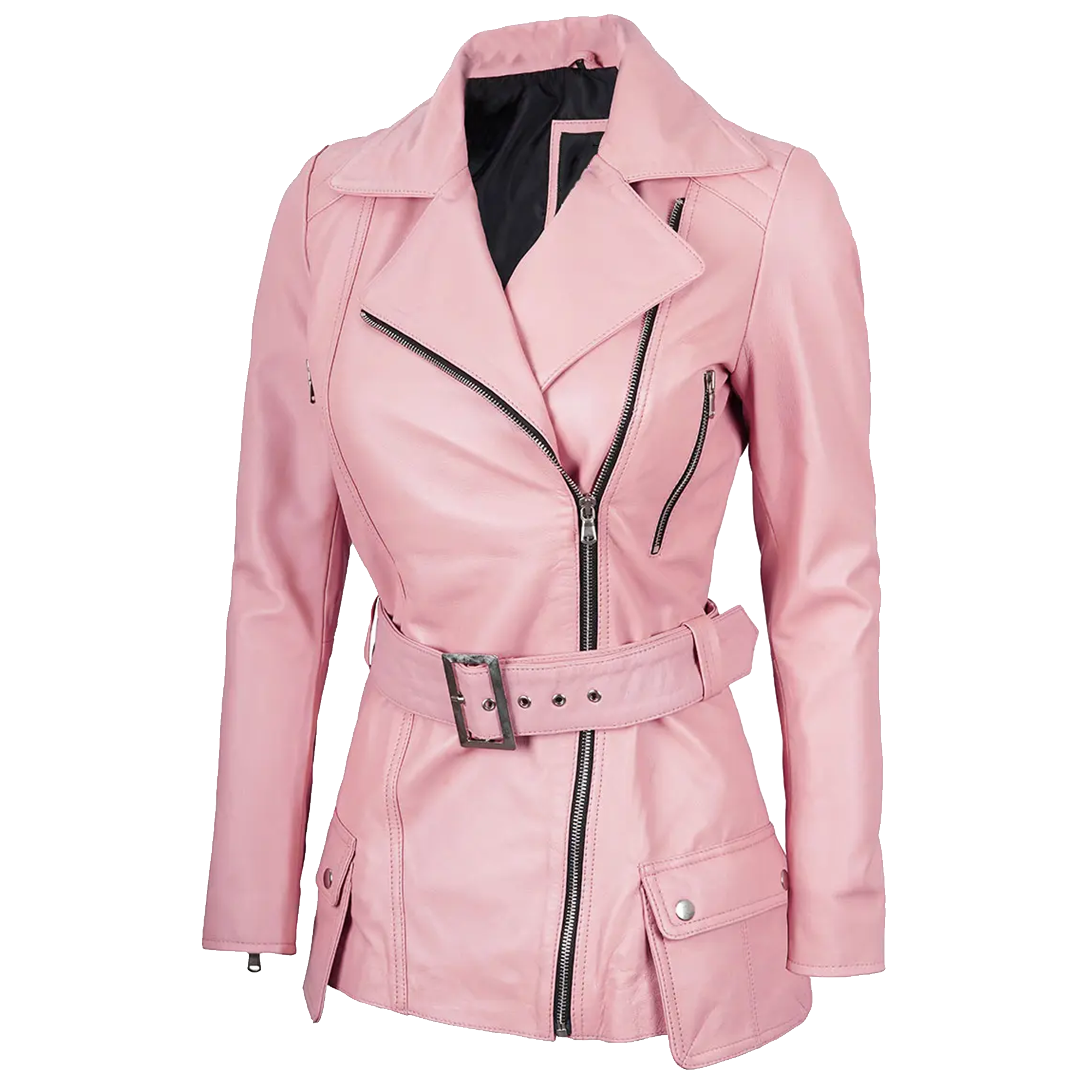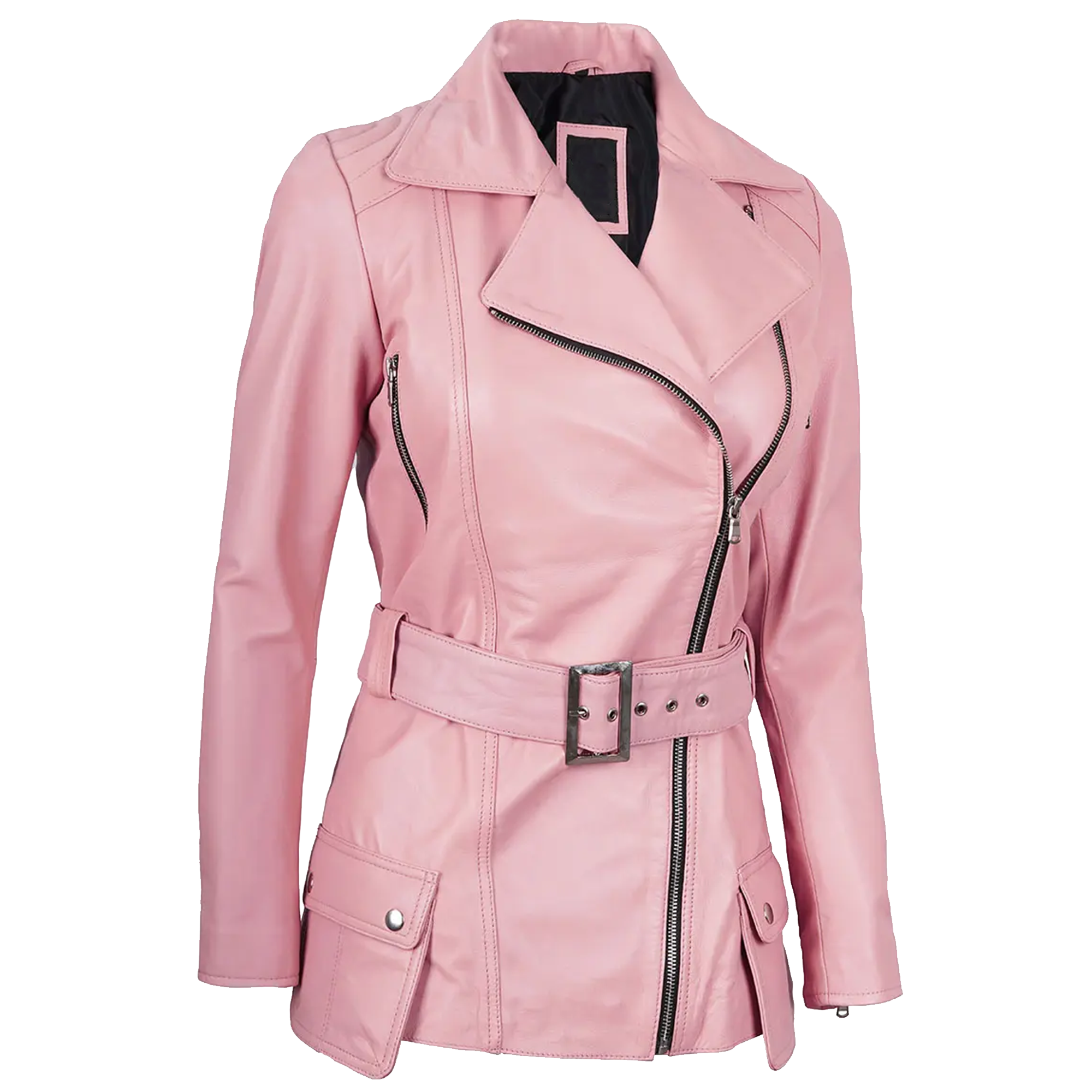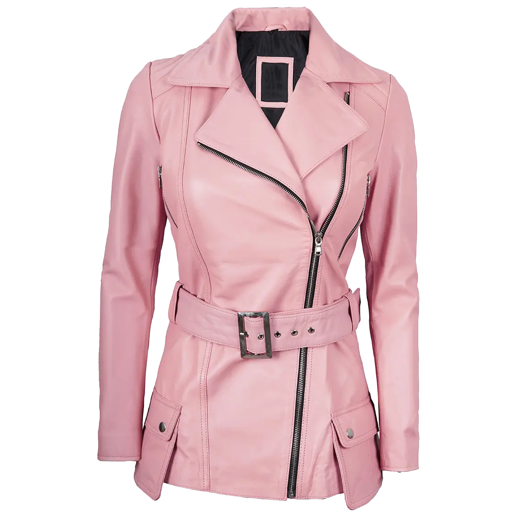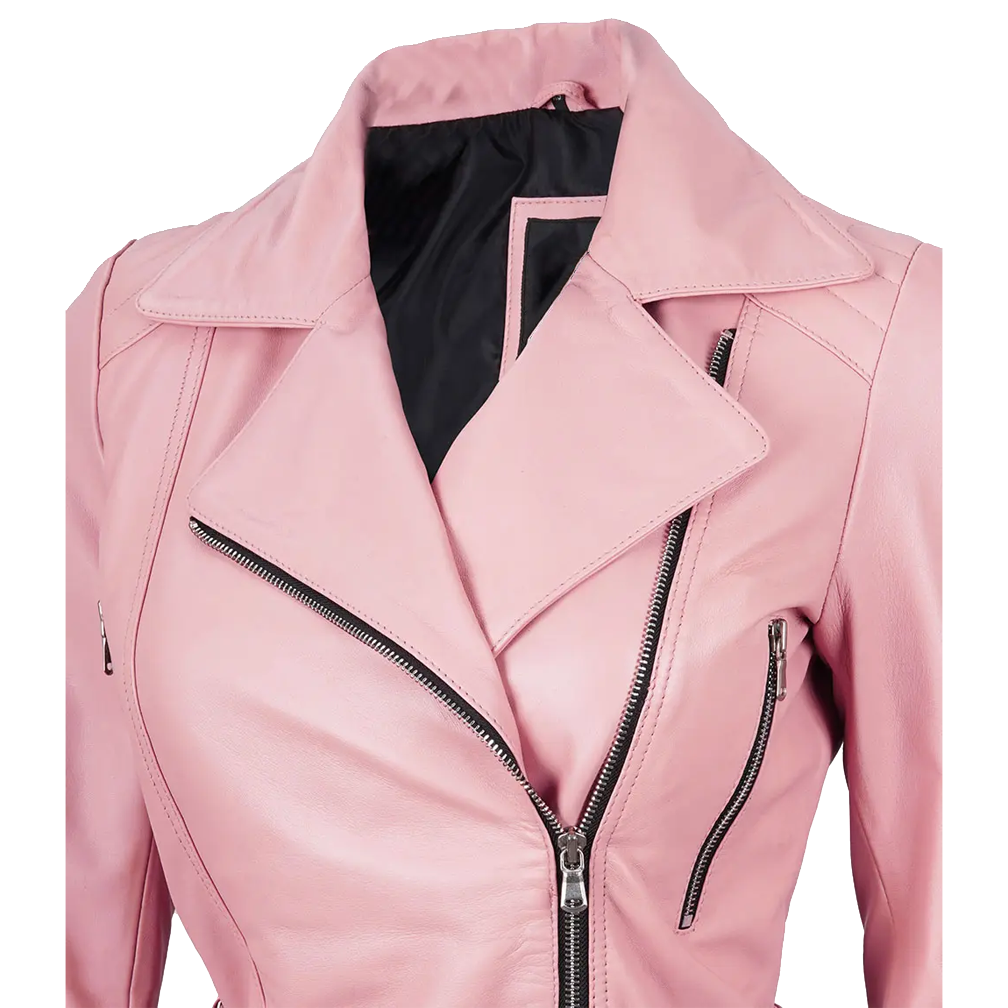 Channel your inner rockstar with this womens light pink leather jacket. Featuring a unique asymmetrical zip closure and flattering belted waist, this jacket adds an edgy touch to any outfit.