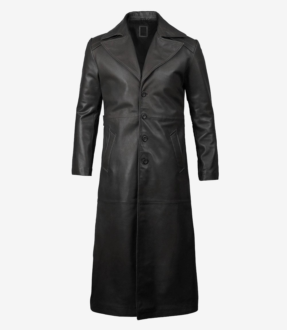 The long black leather duster can be your new go-to essential for winters. Made up of real leather and soft polyester lining. Additional features include front button closure, wide lapels, and extended length.