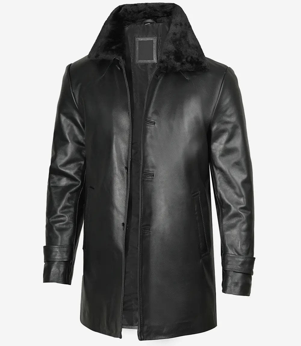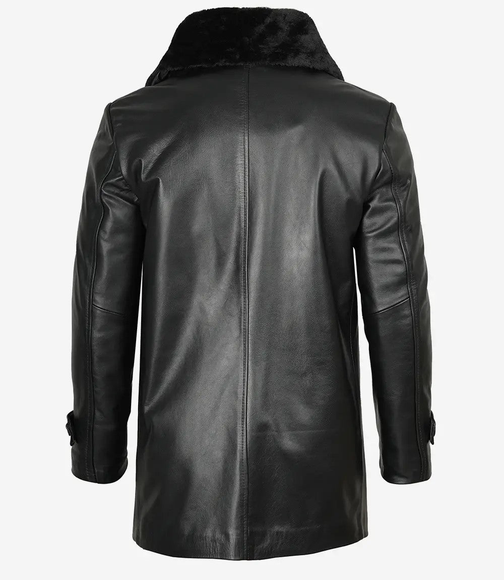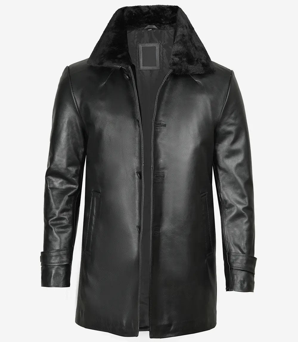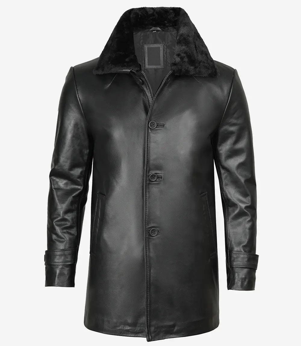 Men's 3/4 Black Real Leather Coat With Fur Collar - Winter Coat
