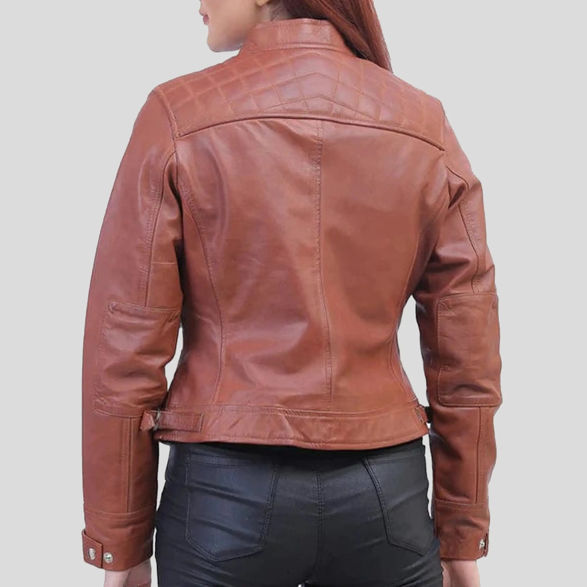 Women Quilted Shoulder Brown Cafe Racer Jacket